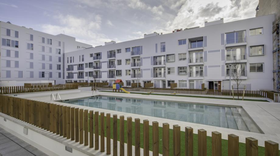 El complejo de 65 viviendas lo conforman tres edificios con fachadas a tres calles y diferentes alturas que rodean una amplia zona comunitaria.
